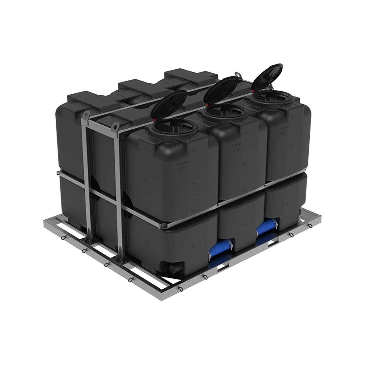 безопасная транспортировка: прочная обрешетка надежно фиксирует емкости, предотвращая их смещение в любом направлении, а низкий центр тяжести всей кассеты обеспечивает повышенную устойчивость транспортного средства в пути;