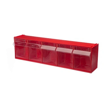 Короб откидной Стелла-техник F-600-5 (600х140х168мм.) 5 ячеек, красный, прозрачный служит для хранения мелкоштучных предметов. Данная система хранения не подвержена случайному опрокидыванию. Откидные стандартные ячейки обеспечивают быстрый доступ к необходимым предметам. В случае необходимости полного высыпания или наполнения внутренние ячейки легко извлекаются. Полезный внутренний размер каждой ячейки 108х98х107мм. Специальный пластик, из которого выполнен короб, выдерживает значительные нагрузки и обладает оптимальной эластичностью. На основе данных коробов можно сформировать многоярусную систему хранения вертикально, в том числе и с коробами других размеров, таких как F-600-9, F-600-6 и F-600-4 по принципу пирамиды. Использование в качестве дополнительного элемента специальных металлических рам, позволяет комплекту коробов нести большие нагрузки в напольном, настольном и настенном варианте. Короб данной модели легко можно прикрепить к стене или установить на специальные кронштейны (Артикул: Кронштейны-FOX-750). Обзорность содержимого сквозь прозрачные внутренние ячейки, наличие отсека для информационных бирок, легкое извлечение внутреннего короба для опустошения и наполнения, все это является неоспоримым преимуществом откидных коробов серии F. Температура эксплуатации от -10 до +70С.