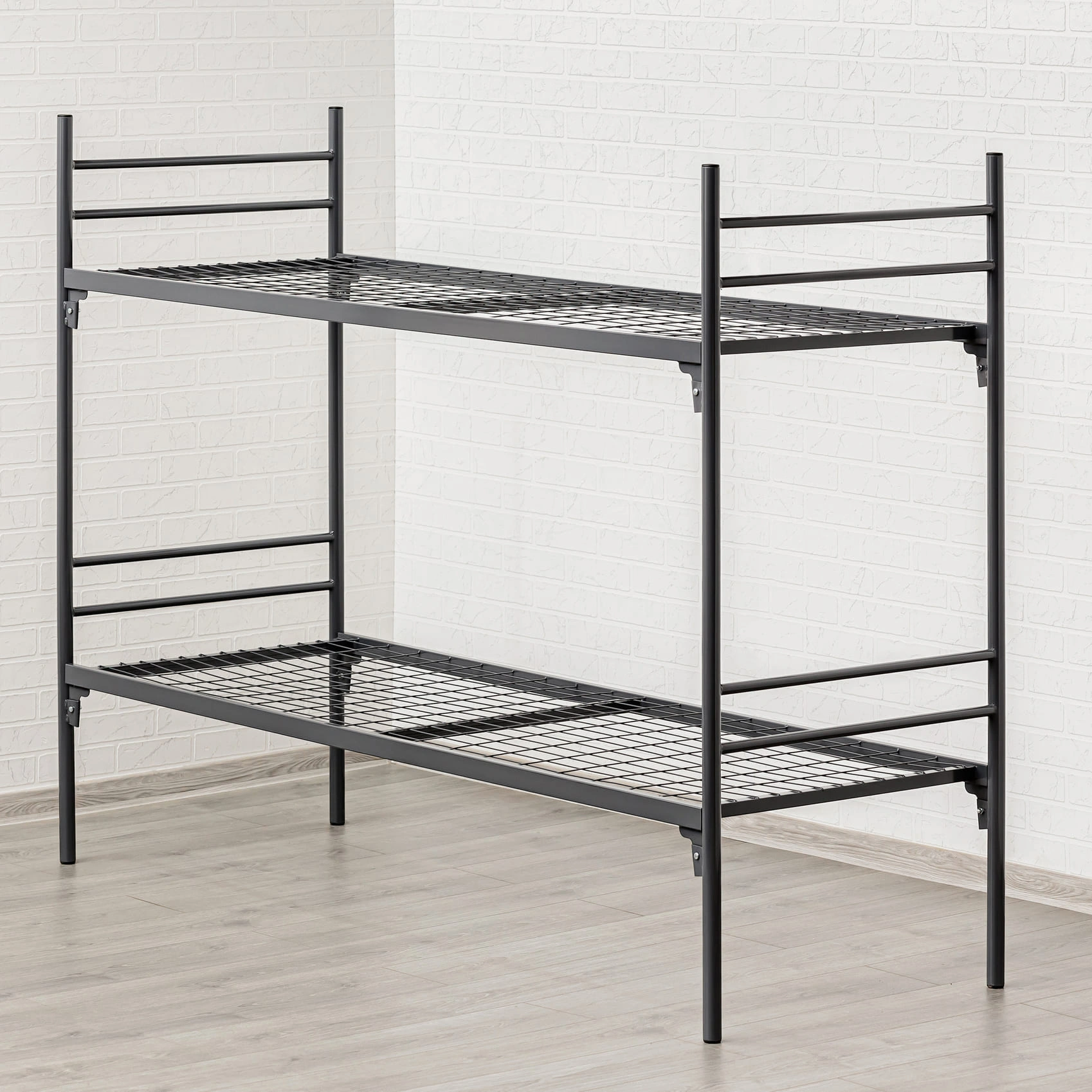 Кровать разборная из двух боковых стоек и двух спальных мест, крепящихся меж собой соединением «клин-петля»., обеспечивая надежное и просто соединение. Стойки изготовлены из круглой трубы Ø32 мм., спальное место выполнено из профильной трубы 20х40 мм. с одним поперечным усилением 25х25, сетка с ячейкой 100х50 мм. Все элементы кровати покрыты износоустойчивой полимерно - порошковой краской сероватого цвета. Допускаемая нагрузка на спальное пространство до 120 кг.