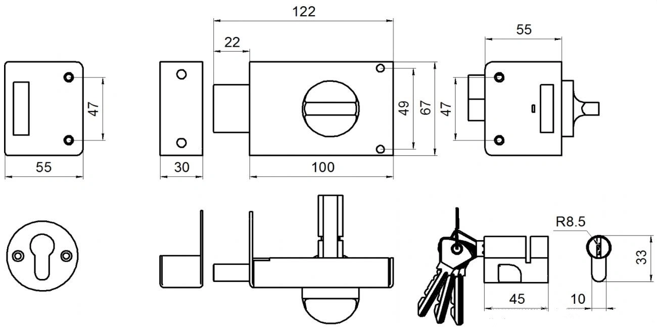 Комплектуется односторонним цилиндровым механизмом с 4 ключами, запорной коробкой и накладкой.
