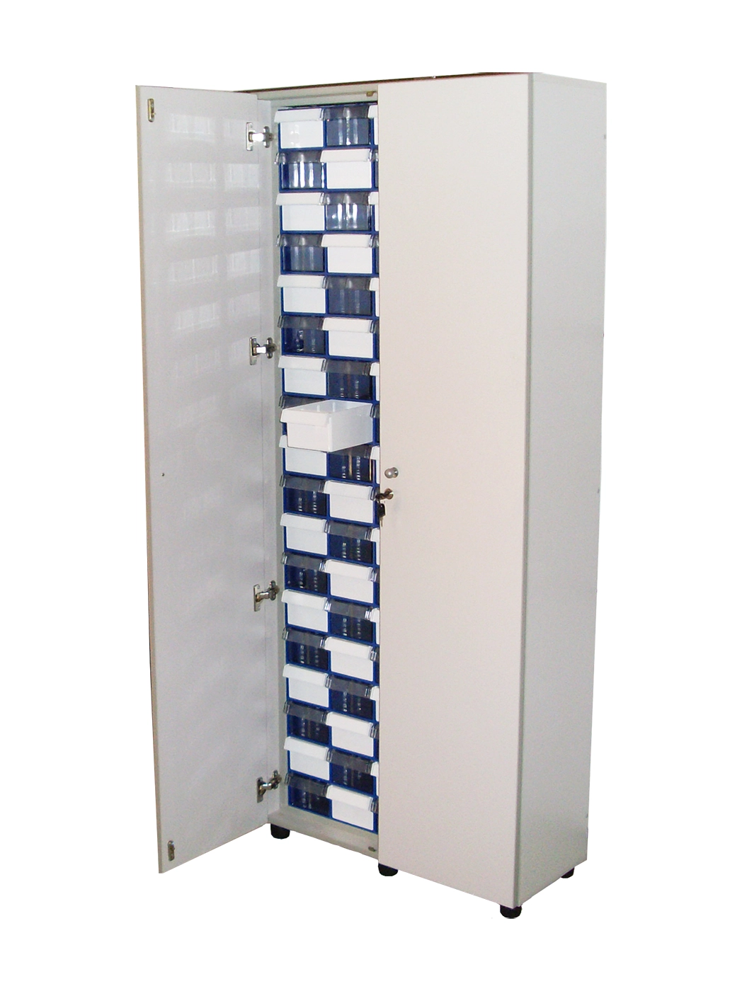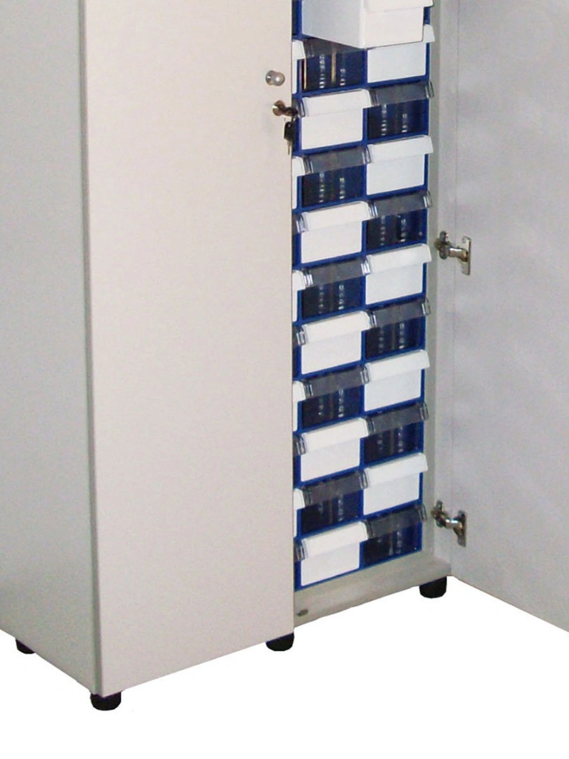 Шкаф в сборе Стелла-техник С-2-90-Д на 90 коробов (ЛДСП) отлично впишется в интерьер любого склада, подсобного или торгового и офисного помещения. Цвет ламинированного ДСП - серый. Цвет коробов С-2 синий, прозрачный. Главная особенность шкафа – объединение большого количества коробов с определенным типовым размером. Наличие дверей позволяет скрыть содержимое шкафа от посторонних глаз и ограничить несанкционированных доступ к содержимому. Регулируемые ножки шкафа гарантируют устойчивость шкафа даже на неровных полах. Изделие допускает одновременное применение 90 пластиковых складских контейнеров. Прозрачные внутренние короба С-2 позволяют легко находить содержимое и контролировать полноту наполнения. Внутренний короб легко вынимается для опустошения или наполнения, по принципу спичечного коробка. Он имеет рельефную структуру днища и усиленные толстые стенки. За счет этого изделие справляются с высокими эксплуатационными нагрузками. Внутренние полезные размеры выдвижного короба: 220х123х80мм. Возможность установки одной продольной перегородки (артикул: С-2 продольная) или до трех поперечных (артикул: С-2 поперечная). Продольная и поперечная перегородки одновременно не устанавливаются. Перегородки в комплект короба не входят и поставляются отдельно. Рекомендуемая нагрузка на короб, в составе шкафа, не более 3кг.