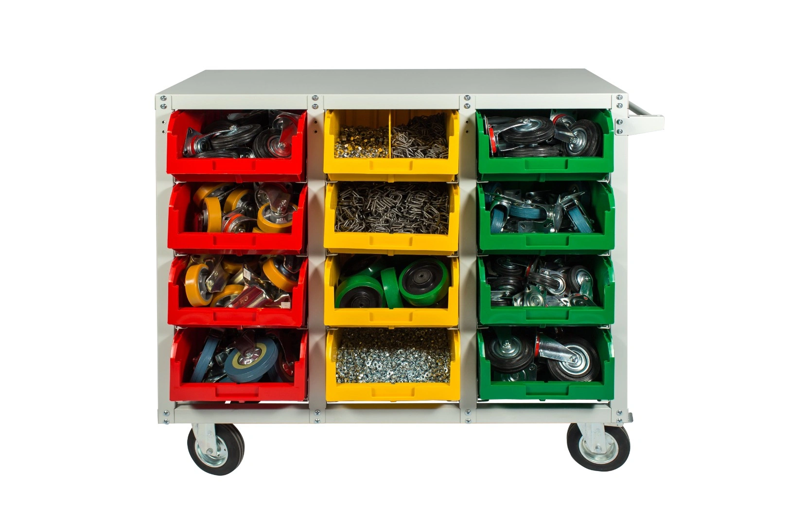 Стеллаж с направляющими мобильный односторонний V4-12 ячеек (160К), грузоподъемность до 300кг. Предназначен для размещения контейнеров V-4 в отдельных ячейках на продольных направляющих. Подходит для эксплуатации в автомастерских, в строительных магазинах, на складах, где необходимо складирование мелкоштучных изделий и инструментов. При использовании вместе с колесами и ручкой, данный стеллаж становится мобильным, что значительно расширяет его функциональные возможности для перемещения хранимых предметов по территории предприятия, склада, цеха. Конструкция ящиков модели V4 обеспечивает быстрый и легкий доступ. Ящики открытого типа позволяют быстро находить нужные позиции, это возможно благодаря хорошему визуальному обзору содержимого. Конструкция стеллажа позволяет одним движением руки извлекать нужный ящик для его наполнения или опустошения, и так же легко устанавливать его на место. Стеллаж поставляется в разобранном виде и состоит из:. металлического каркаса стеллажа с направляющими одностороннего V4-12 ячеек - 1 шт.; ящиков пластиковых модель V-4 - 12 шт.; комплекта колес резина, сталь диаметром 160мм.; ручки. Температурный режим эксплуатации от +20 до +70С.