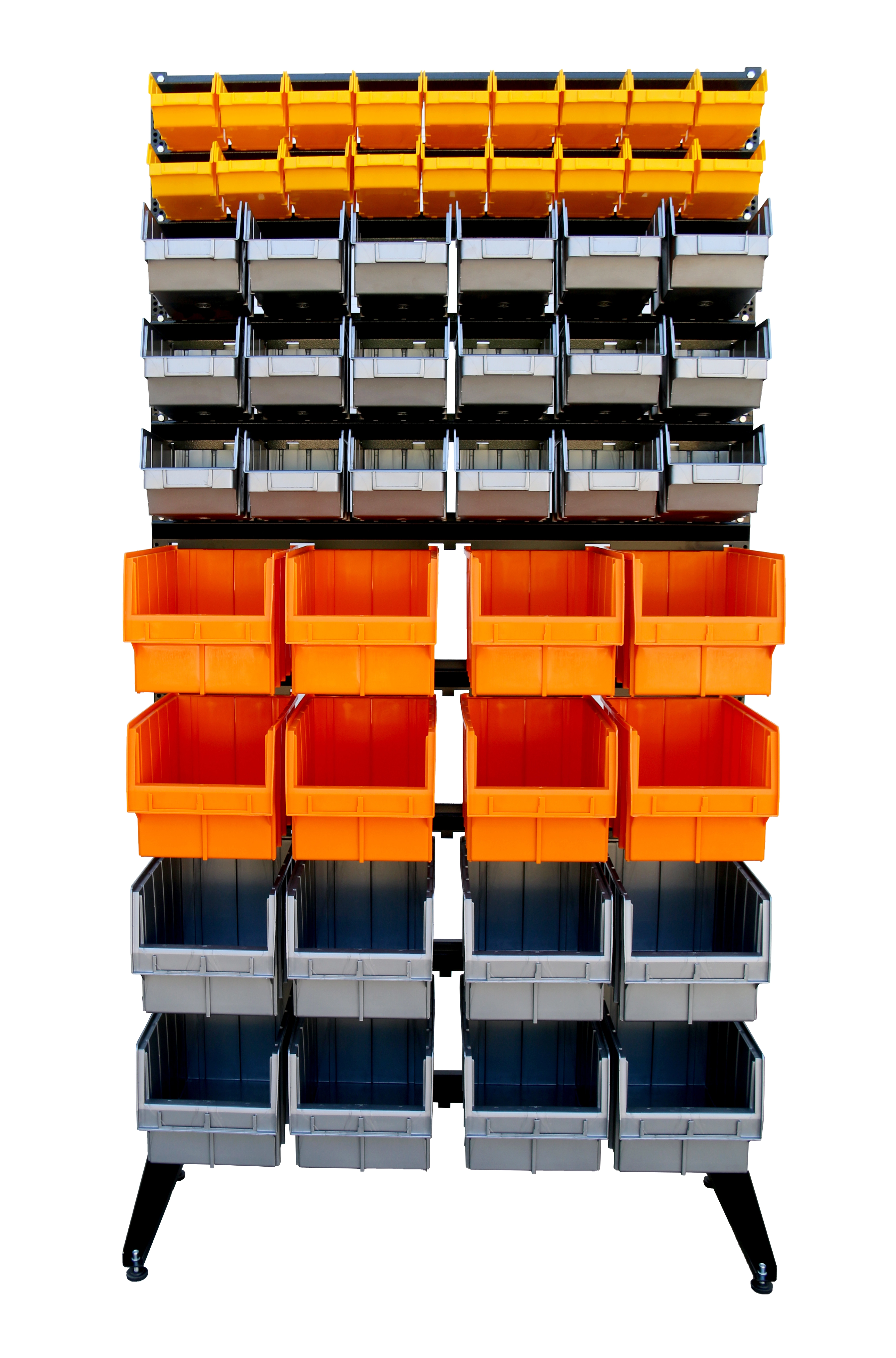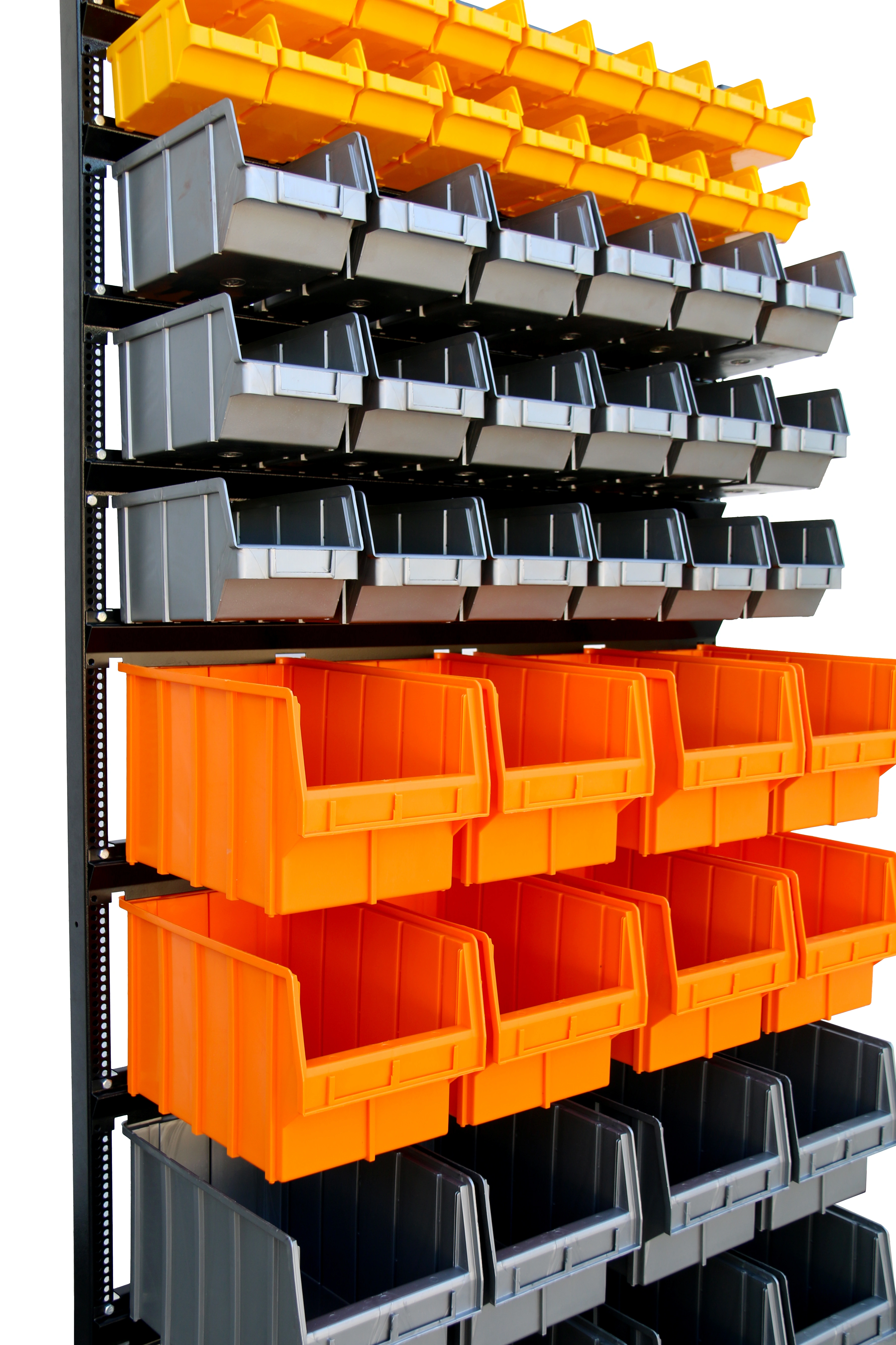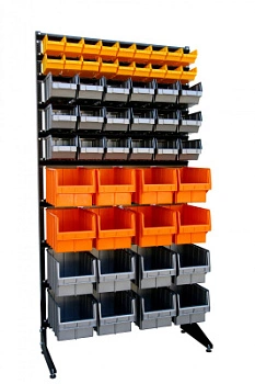Цвета ящиков: оранжевый, желтый, красный, зеленый, синий, чёрный У ящика предусмотрен отсек для написания содержимого (место для шильдика), на передней скошенной стенке, захват, для быстрого съема со стеллажа, ребра жесткости на боковых стенках, сплошное дно. Материал - полипропилен.
