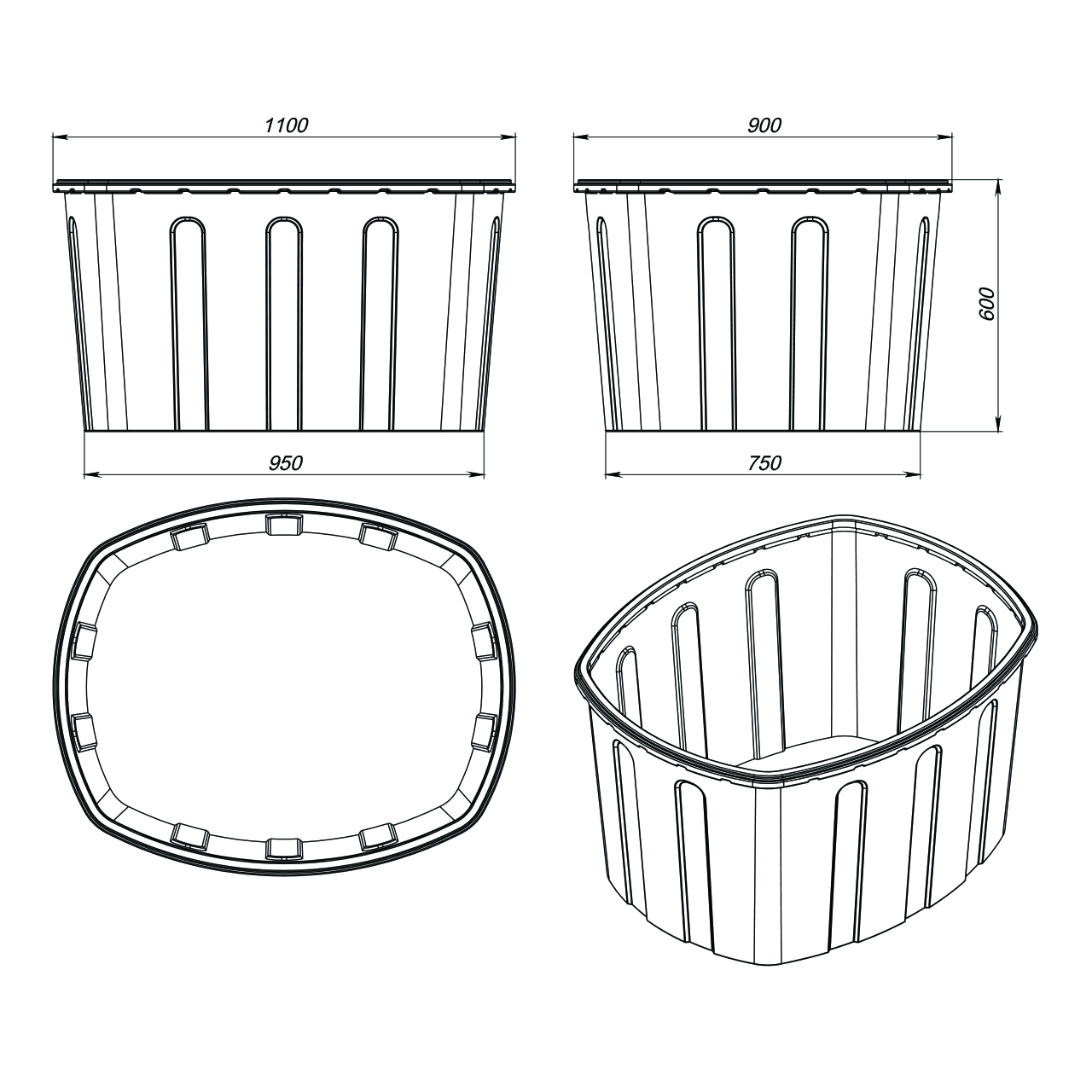 Форма ванны заужена в нижней части, что позволяет складывать ванны одна в другую (штабелировать), что упрощает транспортировку и хранение.